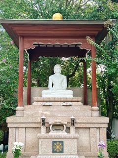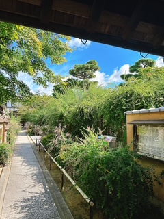 境内には静かに音楽が流れ、手入れの行き届いた庭と柔らかな萩の緑が広がり、荘厳で落ち着いた空気に包まれていました。